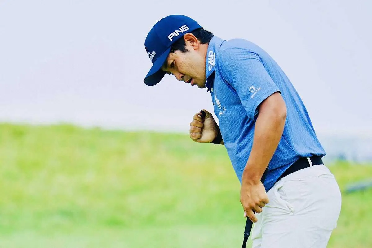 <ベイカレント・クラシック・レクサス最終日>18番、パーセーブしガッツポーズでホールアウトする金谷拓実(撮影・会津 智海)iPhoneから送信
