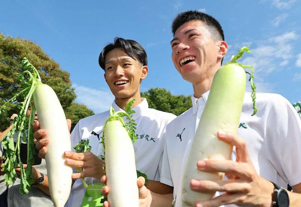 箱根駅伝予選会で大根を持って菅原主将(右)と記念撮影に応じる東農大・前田(撮影・五島 佑一郎)