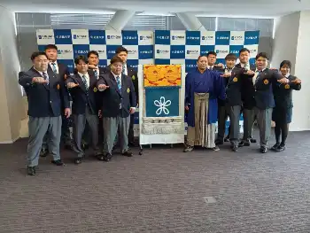 三田 角界入りの目標がかなう 母校・近大が化粧まわしを贈呈 マゲ姿も披露