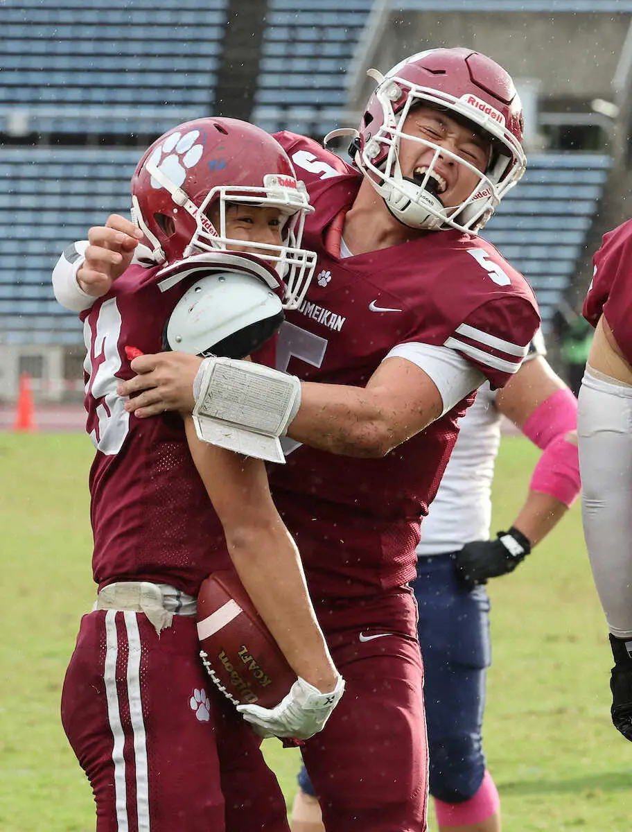 <立命大・関西大>タッチダウンを決めた蓑部(左)は竹田に祝福される(撮影・長嶋 久樹)
