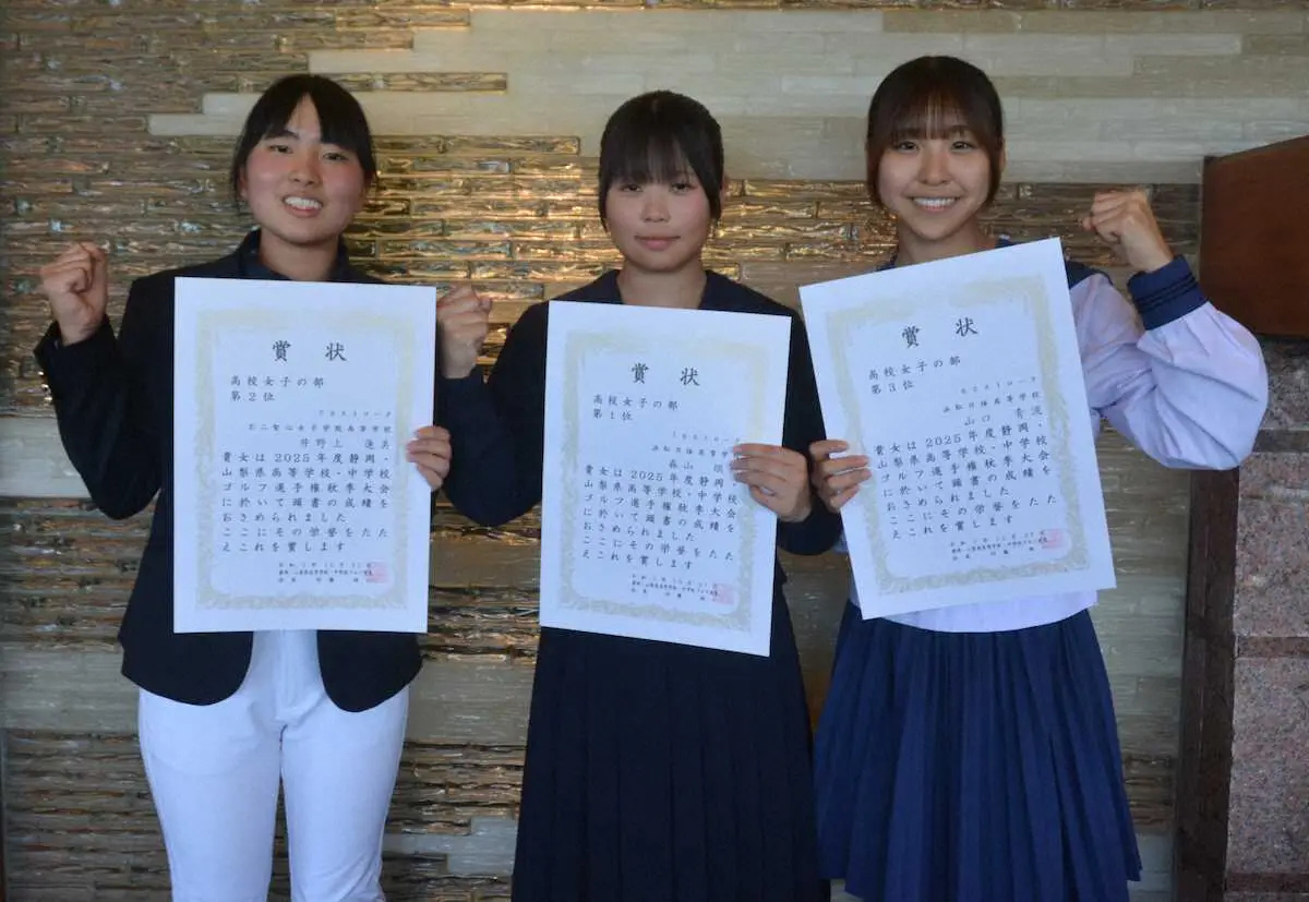 賞状を手に笑顔の高校男子上位3人(左から)稲葉、後藤輝、中林 Photo by スポニチ 静岡・山梨男子・後藤輝 1番で「8」の大叩きも…逆襲V「2番でパーが取れて… ギャラリーで見る この記事のフォト 2025年10月28日の画像一覧 もっと見る 2025年10月28日の画像をもっと見る