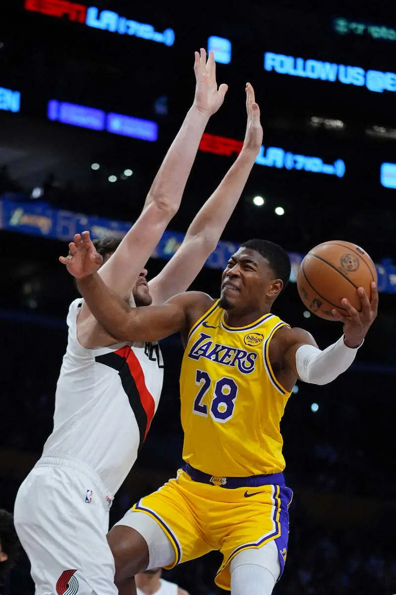 レイカーズの八村塁(27)が27日(日本時間28日)の本拠地ブレイザーズ戦に先発出場。得意の3Pシュートを決めるなど3試合連続の2桁得点となる16得点を記録。しかし故障者続出のレイカーズは、オースティン・リーブスが孤軍奮闘の41得点を記録したが敗戦した。