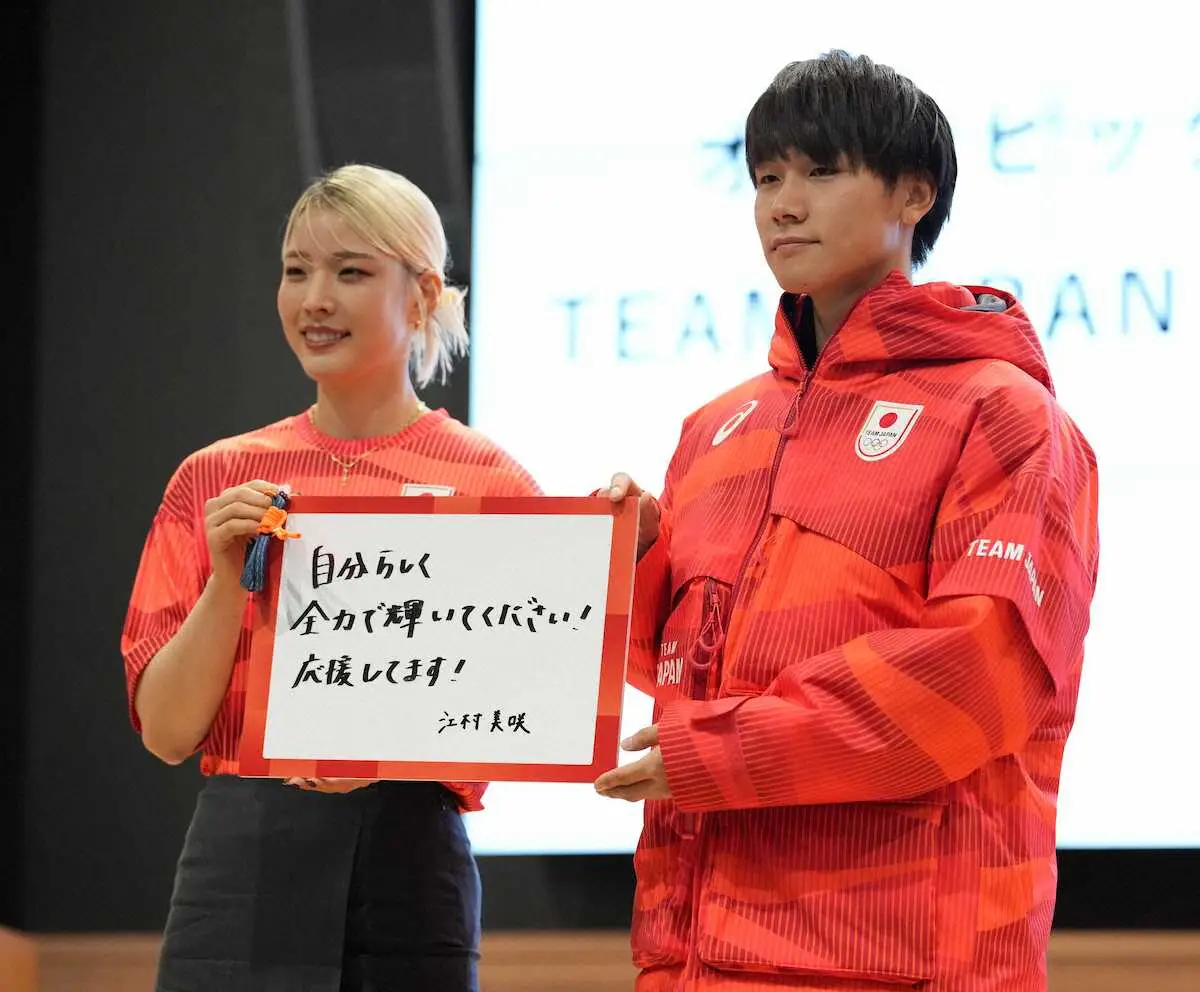 スペシャルゲストとして登場した24年パリ五輪の日本選手団旗手で、フェンシング女子サーブル団体銅メダルの江村美咲(立飛ホールディングス)は「サンライズレッドを見ると、パリを思い出す。同じカラーのウエアを着ることで、一つのチームと感じる。ワンチームで私たちも共に戦っている気持ちで全力で応援したい」と話した。