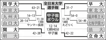 アメフトの全日本大学選手権準々決勝2試合が23日、名古屋市のパロマ瑞穂ラグビー場などで行われ、関学大(関西1位)が63―21で中京大(東海)に快勝した。東北大(東北)を31―7で下した早大(関東1位)とともに4強入り。準決勝は立命大(関西2位)―早大、関学大―関大(関西3位)に決まり、29、30日に行われる。
