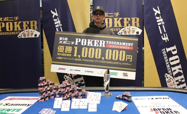 「第5回スポニチポーカートーナメント」(スポニチ主催、ボートレース江戸川、サミー、パラダイスシティ、ABSENTE協賛)のDAY2(決勝)が9日、東京・ボートレース江戸川で行われ、群馬県の齋藤慧悟さん(26)が大会初出場で初優勝を飾った。優勝特典として海外渡航補助100万円、韓国パラダイスシティ宿泊券、「PARADAISE CITY POKER SERIES」20万ウォンバウチャー、ゼビオグループ商品券が贈られた。