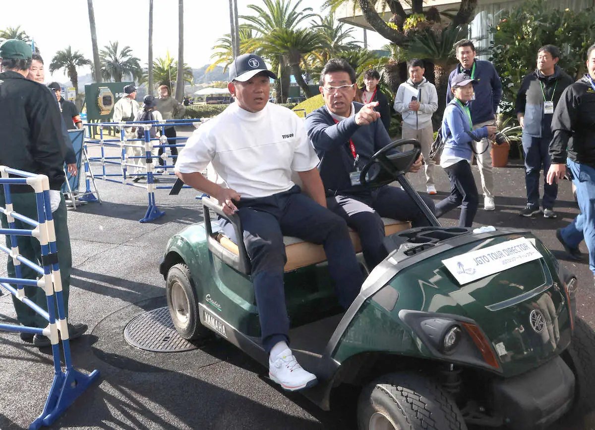 <カシオワールドオープン2日目>左ふくらはぎ肉離れのため棄権し、カートで引き上げる松坂大輔氏(左)(撮影・椎名 航)