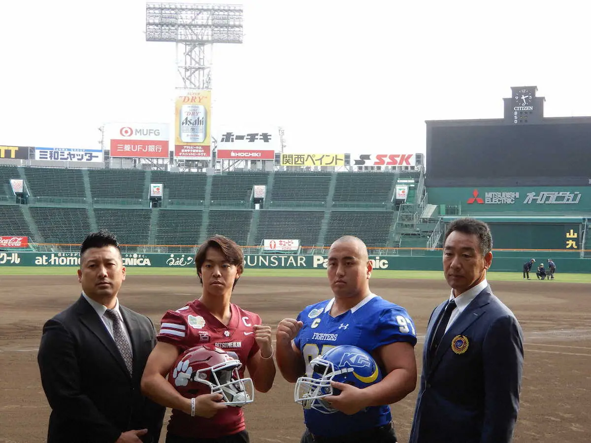 決戦の地、甲子園球場で記念写真に収まる(左から)立命大・高橋健太郎監督、今田甚太郎主将、関学大・前田涼太主将、大村和輝監督(撮影・堀田 和昭)