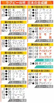 27年にオーストラリアで開催されるラグビーW杯の組分け抽選会が3日、シドニーで行われ、11大会連続11回目の出場となる世界ランキング12位の日本は1次リーグE組に入り、フランス(5位)、米国(16位)、サモア(19位)と同組となった。試合日程と会場は、来年2月初旬に発表される見通し。