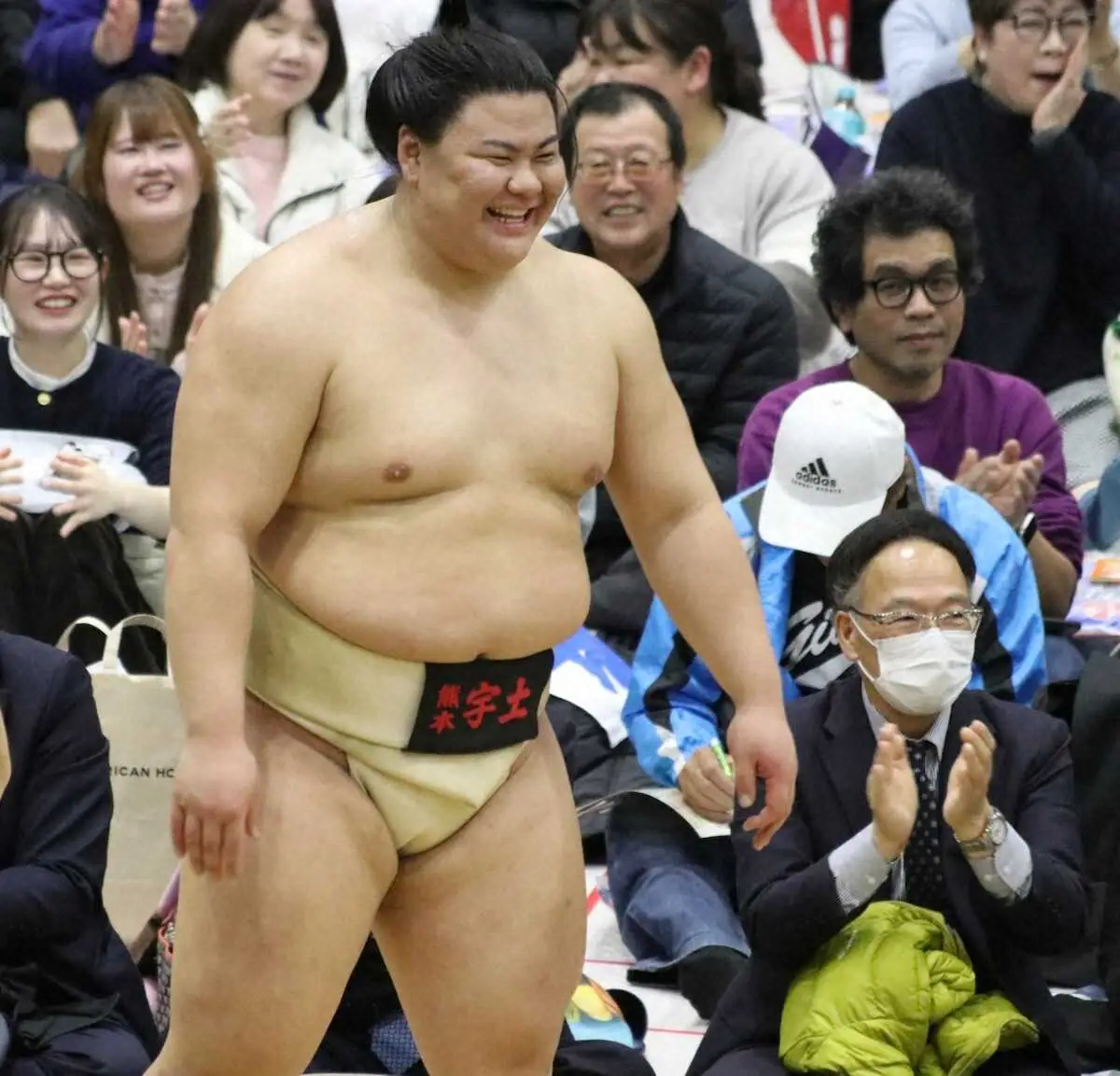 熊本県宇土市出身。場内アナウンスで紹介されると、訪れた約3000人から大きな拍手や声援を浴び「人が多いっすね。チケットも完売して良かったと思う。田舎の方だとガラガラで力士のモチベーションにもつながる。人が多くて満杯で良かった」と笑顔を見せた。