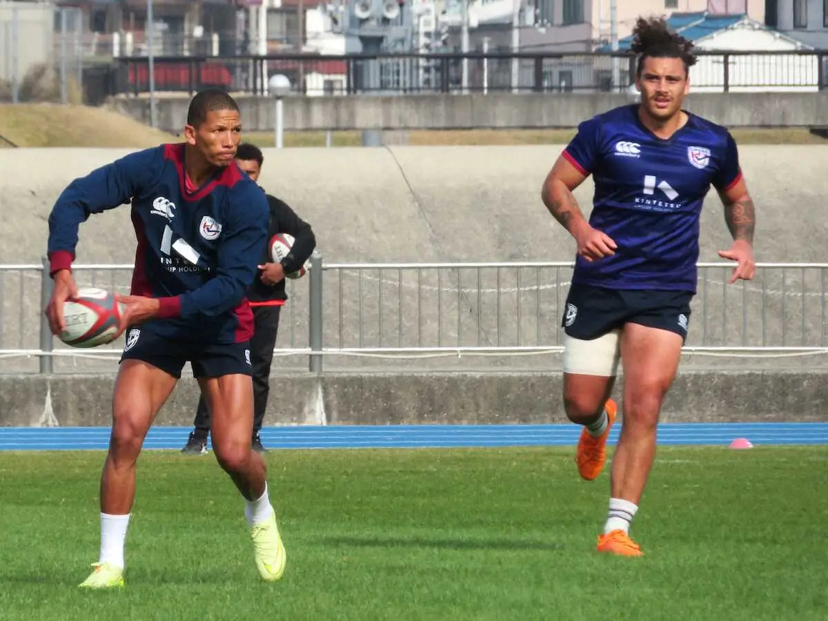 全体練習で華麗なパス回しを見せた花園SO・リボック、右はCTBピーター・ウマガ
