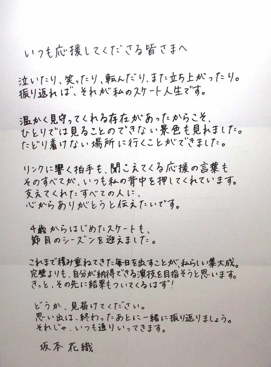 坂本花織の“手紙” Photo by スポニチ 「泣いたり、笑ったり、転んだり」坂本花織の直筆メッセージが表参道駅に… ギャラリーで見る この記事のフォト 2025年12月19日の画像一覧 もっと見る 2025年12月19日の画像をもっと見る