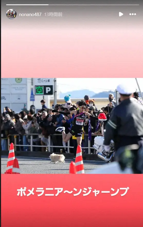 3区を走った国学院大の野中恒亨(3年)は自身のインスタグラムのストーリーズを更新し、「ポメラニア~ンジャーンプ」とつづって、犬を避けようとジャンプする瞬間の写真を投稿した。
