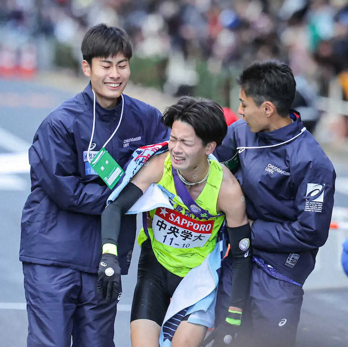 9位と3秒差の10位でたすきを受けた10区の成川(4年)は、箱根初出場。当初は「日大マーク」と指示を受け、3キロ付近で並走した。だが一斉スタートながら前を走る帝京大の大逆襲で残り1キロでは「帝京と2秒差」と指示が出るなど、混乱もあり「腕と脚がけいれんしてしまった」と声を詰まらせた。