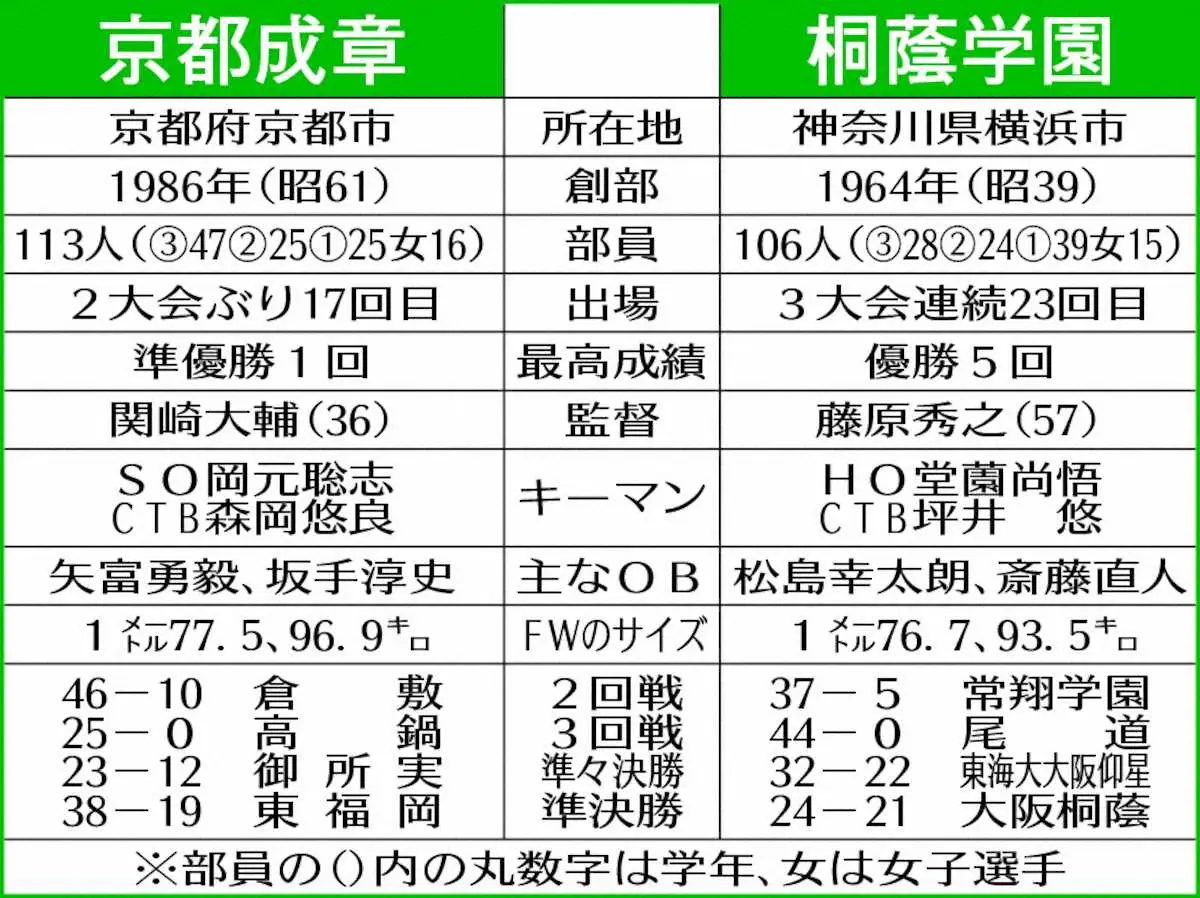 表・京都成章―桐蔭学園の花園大会での対戦成績 Photo by スポニチ 【高校ラグビー】京都成章 初V王手!高校日本代表候補CTB森岡が千金T「み… ギャラリーで見る この記事のフォト 2026年01月06日の画像一覧 もっと見る 2026年01月06日の画像をもっと見る