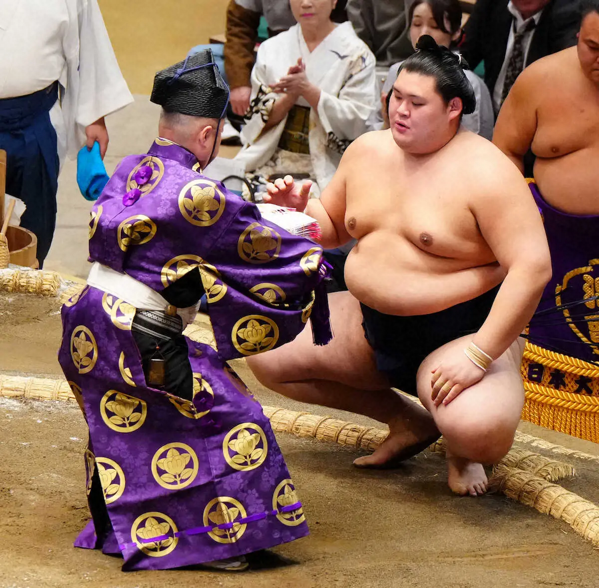 <大相撲初場所2日目>勝ち名乗りを受ける大の里(撮影・大城 有生希)