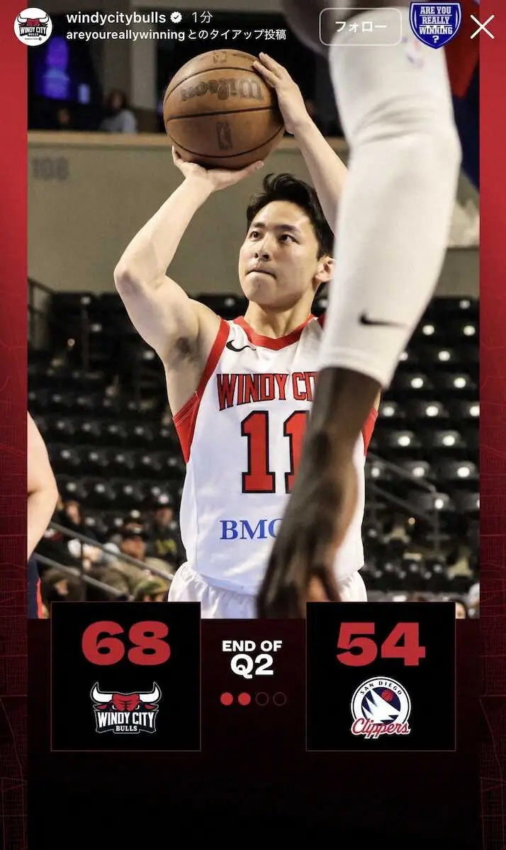 NBAブルズの下部組織ウィンディシティ・ブルズの河村勇輝(24)が15日(日本時間16日)敵地サンディエゴ・クリッパーズ戦から復帰した。前半から絶品バウンズパスを披露するなど2得点4アシストを決めた。チームも68ー54と前半リードで折り返した。