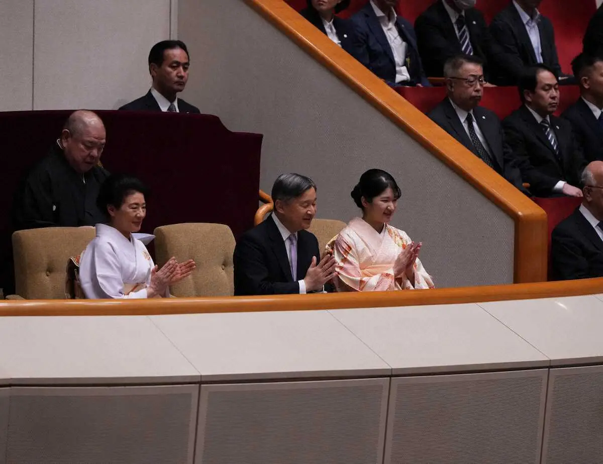 天皇、皇后両陛下と長女愛子さまは親方衆が出迎える中、国技館に来館された。幕の内後半の取り組みの前に2階の貴賓席に穏やかな笑顔で着かれると、館内は総立ちで大きな拍手が起こった。天皇陛下はスーツ、皇后陛下は白を基調とした着物、愛子さまは華やかなピンクの振り袖姿。八角理事長が説明役を務めた。