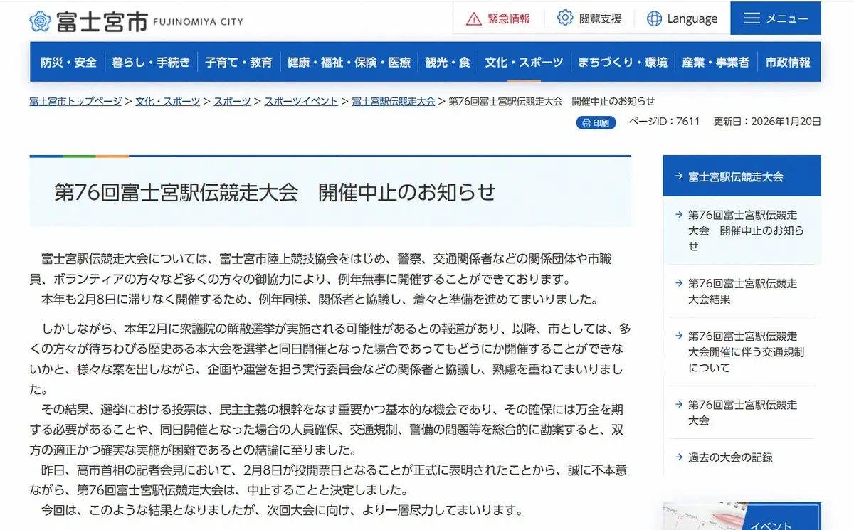 市の公式サイトで「本挙における投票は、民主主義の根幹をなす重要かつ基本的な機会であり、その確保には万全を期する必要があることや、同日開催となった場合の人員確保、交通規制、警備の問題等を総合的に勘案すると、双方の適正かつ確実な実施が困難であるとの結論に至りました」とし、「高市首相の記者会見において、2月8日が投開票日となることが正式に表明されたことから、誠に不本意ながら、第76回富士宮駅伝競走大会は、中止することと決定しました」と伝えた。