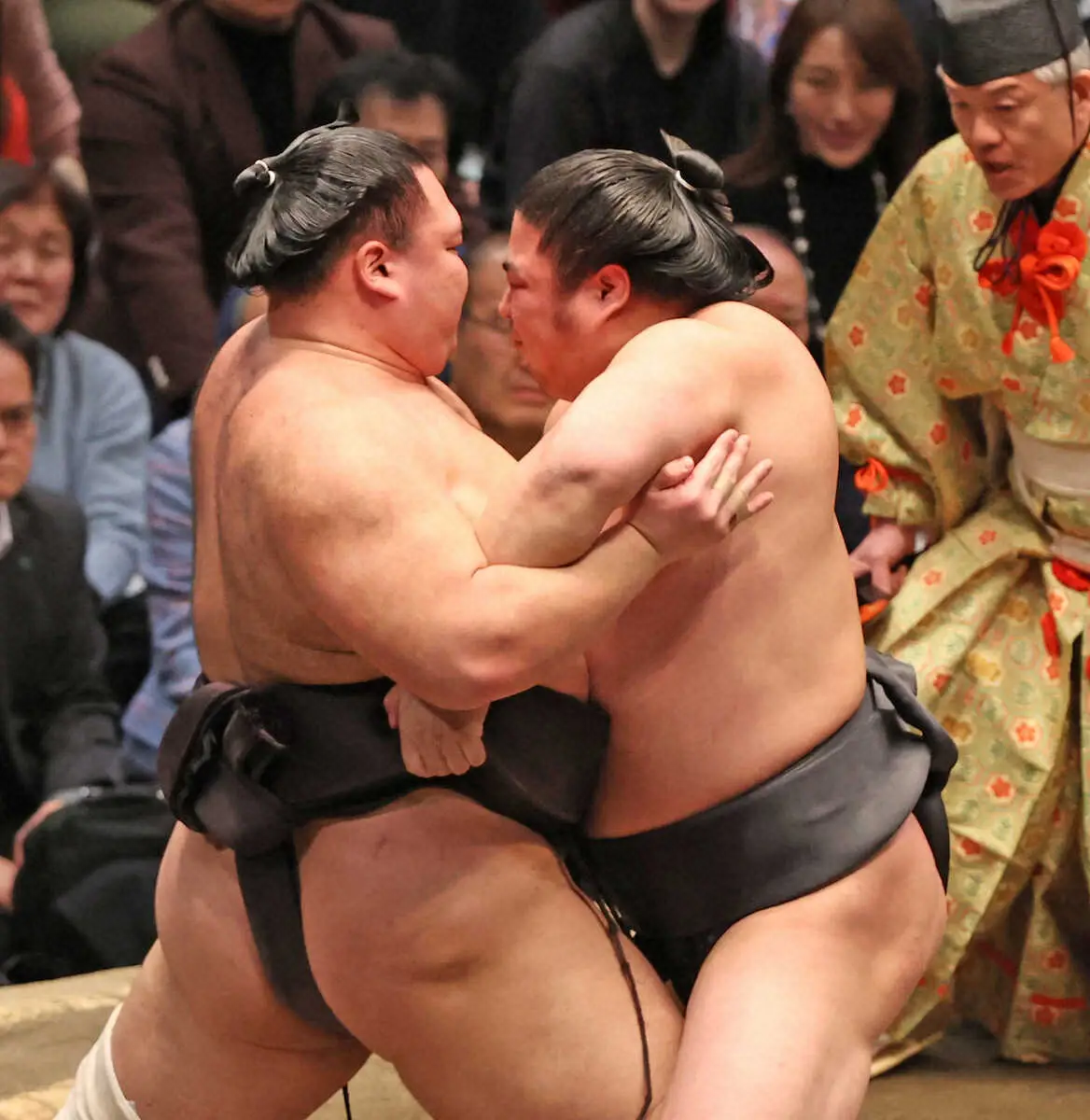 <大相撲初場所14日目>朝乃山(左)は右おっつけを見せるものの、若元春は左四つで攻める(撮影・西海健太郎)