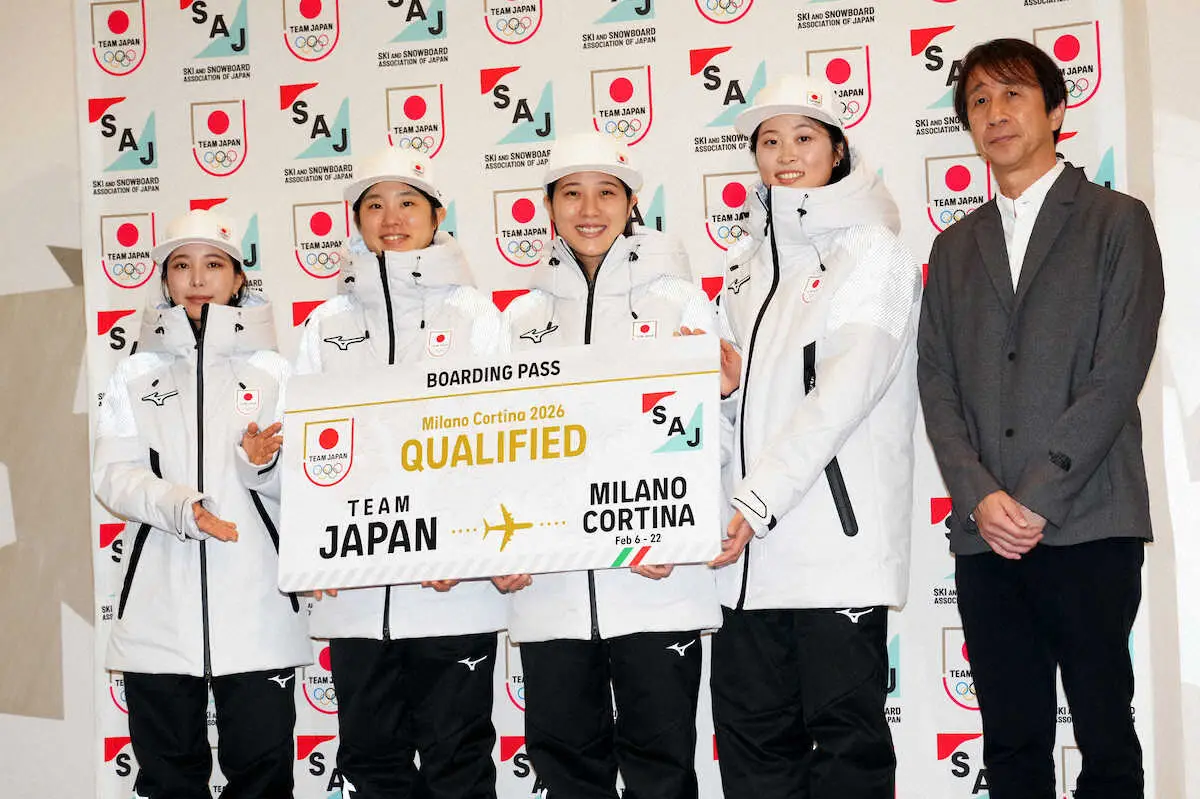 <女子スキージャンプ五輪代表会見>ミラノ・コルティナ五輪行きボードを手にポーズする(左から)高梨、伊藤、丸山、勢藤と原田会長(撮影・高橋 茂夫)