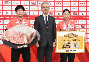 全日本卓球表彰式 全農から男子優勝・松島輝空、女子優勝・張本美和に豪華副賞授与
