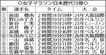 矢田に「30キロの壁」はなかった。沿道からの声援に笑顔で応え続け、ペースメーカーが外れた30キロ以降も何度もトップに躍り出た。差をつけられても、41キロ手前で力を振り絞り2位に浮上。「凄く楽しかった。きつい中でも幸せを感じながら走ることができた」。アフリカ勢に食らいつき、初マラソン日本最高記録の2時間19分57秒をたたき出した。