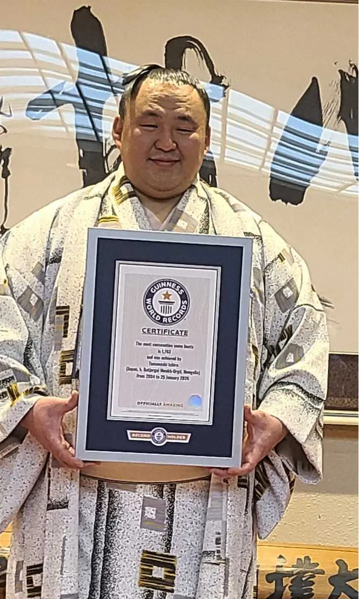 ギネスブック「2026年版」で「MOST CONSECTIVE SUMO BOUTS(大相撲最多出場)」と紹介され、2004年の初土俵から休まずに土俵に上がり、2024年秋場所3日目で青葉城の持つ歴代1位記録(1630回)を更新。1月の初場所を終えて1763回まで伸ばしている。