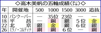 ◇高木 美帆(たかぎ・みほ)1994年(平6)5月22日生まれ、北海道幕別町出身の31歳。北海道・帯広南商高、日体大出。5歳でスケートを始める。14年ソチ大会は代表選考会で落選したが、五輪4度出場。18年平昌の団体追い抜き、22年北京の1000メートルで金メダル。W杯日本勢最多の通算38勝。19年3月に出した1500メートル1分49秒83は現在の世界記録。家族は両親と兄、姉・菜那さん。身長1メートル65。