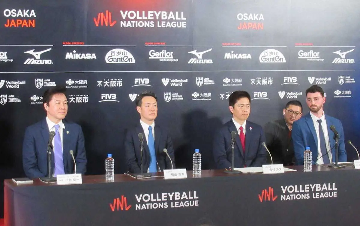 会見には日本バレーボール協会の川合俊一会長、国際バレーボール連盟のジェレミー・バイヤー氏、吉村洋文・大阪府知事、横山英幸・大阪市長が出席。吉村府知事は「ネーションズリーグが大阪で開催されるのが本当にうれしいし楽しみ」と話し、現役時代に日本代表で活躍した川合会長を引き合いに出し「第2の川合俊一、第3の川合俊一が生まれれば」と期待を寄せた。その川合会長も「今回、ネーションズリーグが大阪で開催されるのがうれしい。もの凄く楽しみ」と笑みを浮かべた。