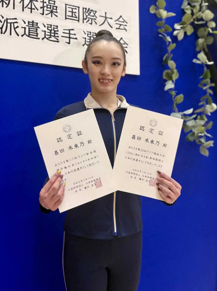新体操の国際大会派遣選手選考会が3月14日に都内で行われ、喜田未来乃(20=エンジェルRG・カガワ日中)がアジア大会(9~10月、愛知・名古屋)などの代表に内定した。