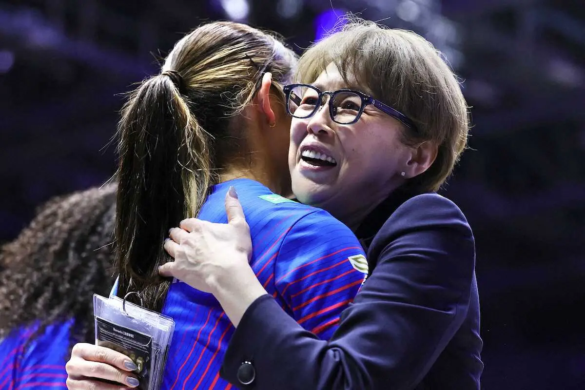 <SV.LEAGUE WOMEN CHAMPIONSHIP Finals SAGA久光・大阪M>勝利し、北窓(左)と抱き合うSAGA久光・中田監督(撮影・藤山 由理)