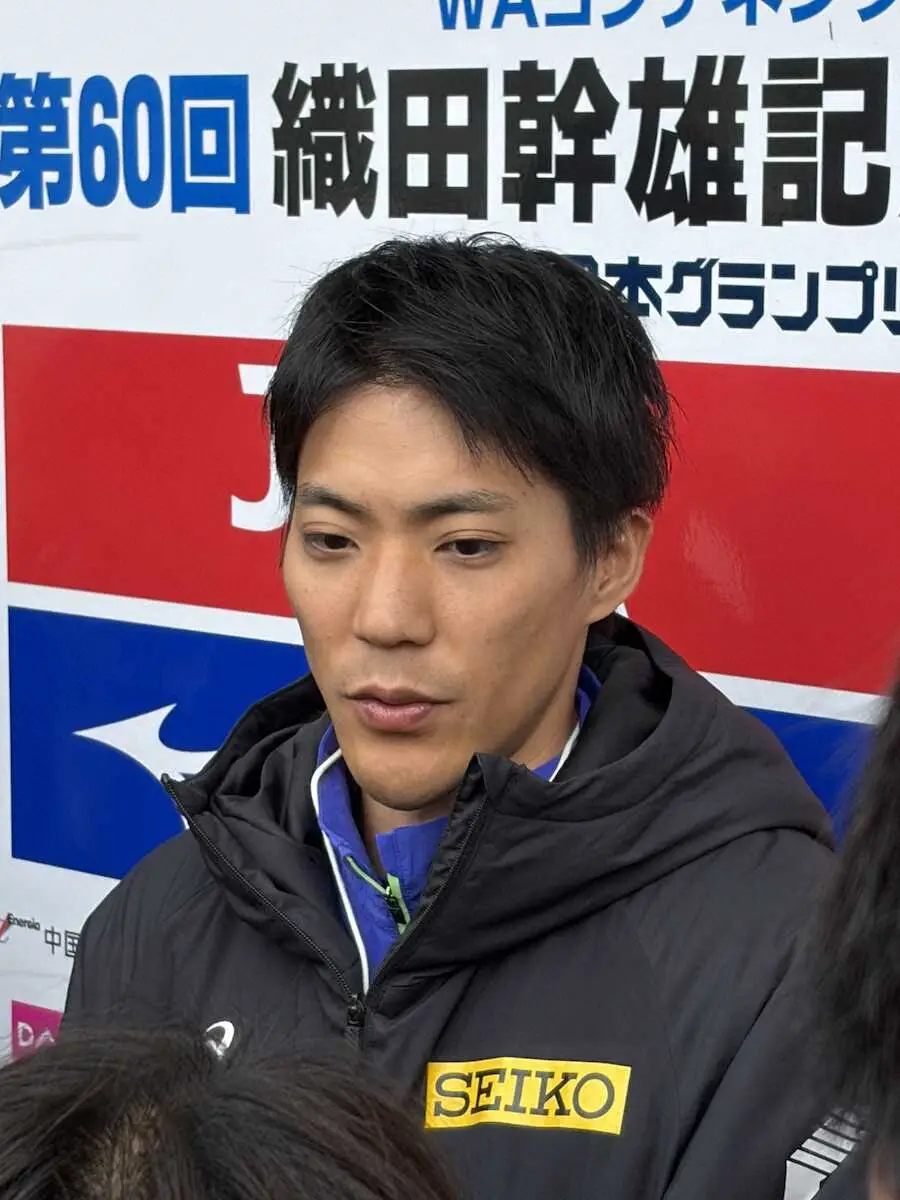 予選が終わった後に報道陣の取材に対応。レース前に右太腿裏に張りが生じ「全力で走るのはリスクが高い」と欠場を決めた。